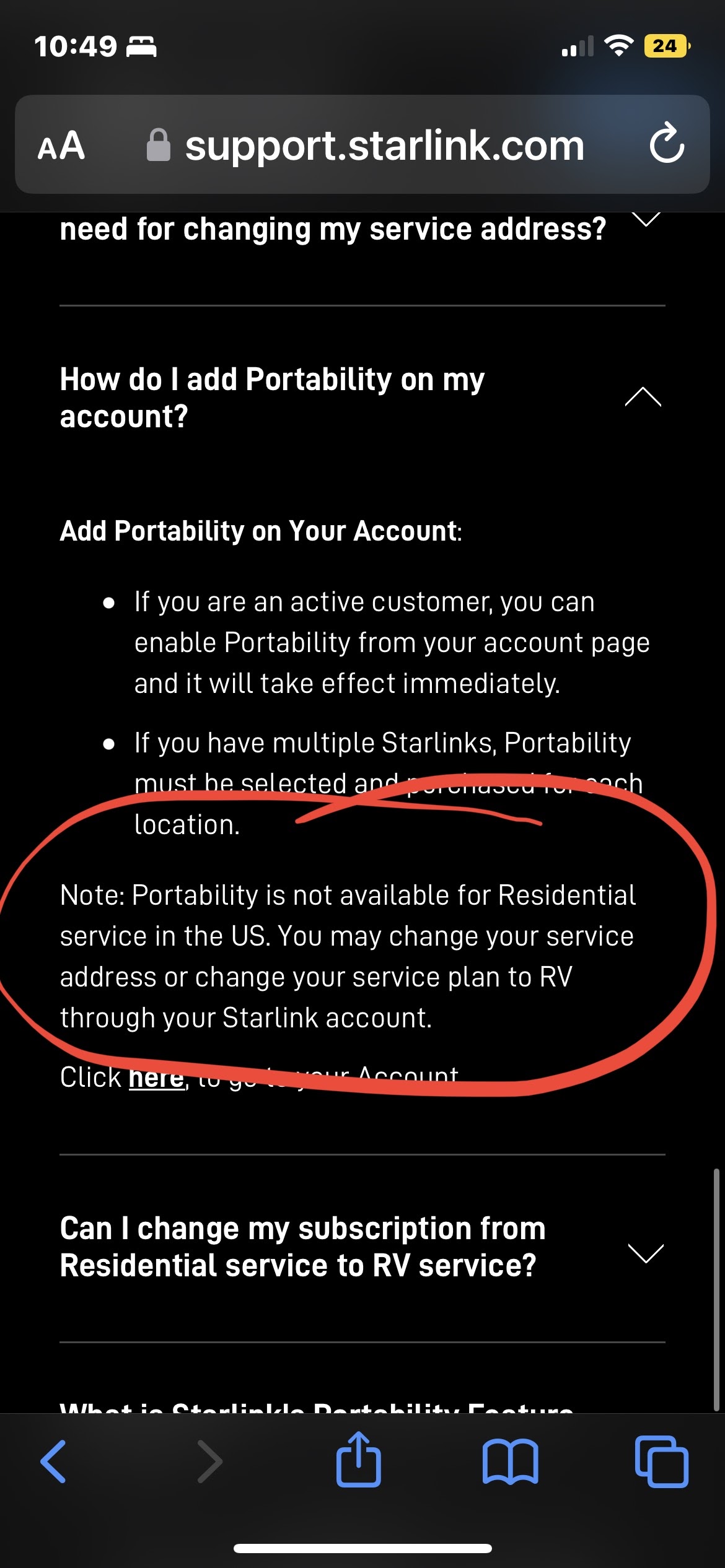 This is a huge change for many users, including part time RVers who have a permanent home where they spend most of their time, but travel part time and bring their Starlink with them by adding month to month portability. It seems interesting that instead of grandfathering in customers who have been using this service for almost a year, they are choosing to take away the service altogether. It almost seems like a bait and switch where customers were lured in and promised Residential Portability and then Starlink takes it away after their loyal customers have invested in their system and promoted it to their friends and neighbors.